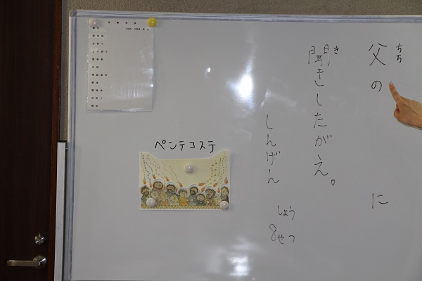 | 今日は父の日です。神様・聖霊・イエス様の三位一体の神様を信じ、共にいてくださることへの感謝をするお話をしてくださいました。最後は 父の日のプレゼントとして折り紙をYシャツとネクタイにおり、メッセージを添えて持ち帰りました。また、牧師先生も参加くださり、讃美歌の伴奏をしてくだ さいました。感謝いたします。次週もご参加いただけなかった方は、是非お待ちいたしております。 |
