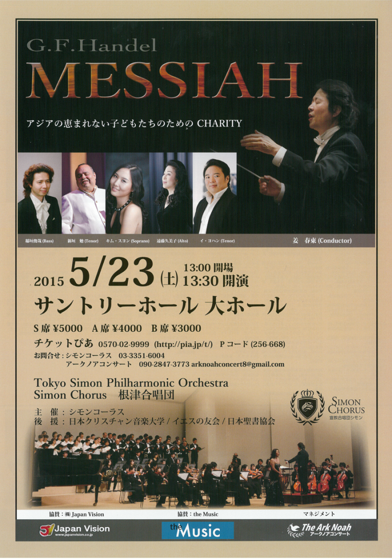 久しぶりのブログを更新です!アジアの恵まれない子供たちのためのCHARITYコンサート‶G.F.Handel Messiah”がサントリー大ホールで13:30より行われました。会場には教会関係の先生方をはじめ、大勢の方が来場されており、このコンサートの注目度の高さを感じました。このコンサートでMESSIAHを聴く機会が与えられたことはとても感謝です。休憩を挟み、16:00過ぎまで約3時間行われましたが、終演をむかえた時に感じた感動が今も残っております。歌われていた曲目の中で知っている曲も数曲ありました。その中でもハレルヤコーラスの時は、観客席に立ち観られている方もいました。