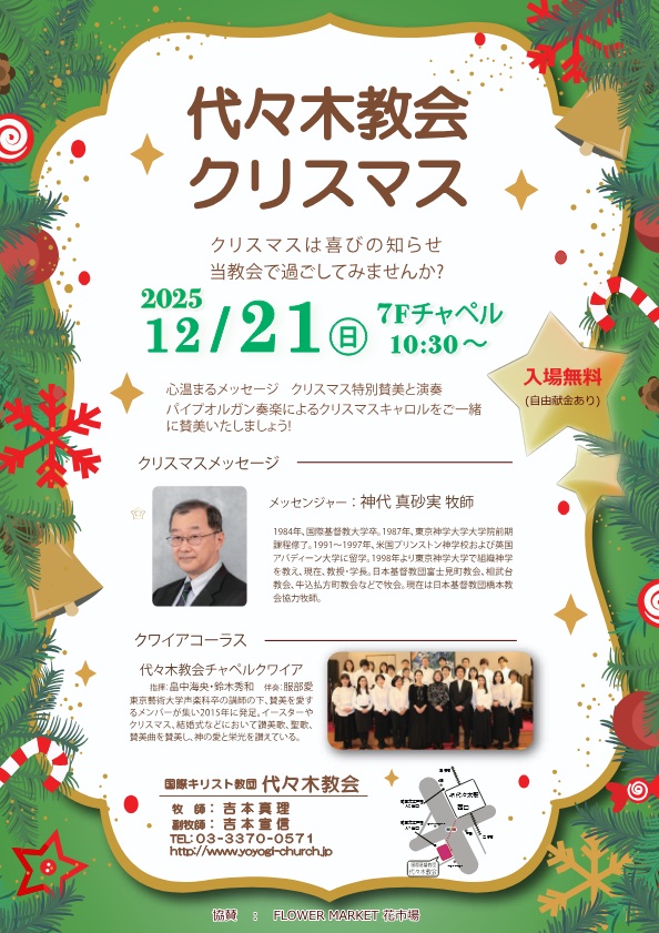 2025年12月21日(日)代々木教会クリスマス 投稿日: 2025年10月15日 投稿者: webmaster 日時:2025年12月21日(日)10時30分~ 場所:代々木教会7Fチャペル このチラシ(PDF形式・1.17MB)をダウンロードする